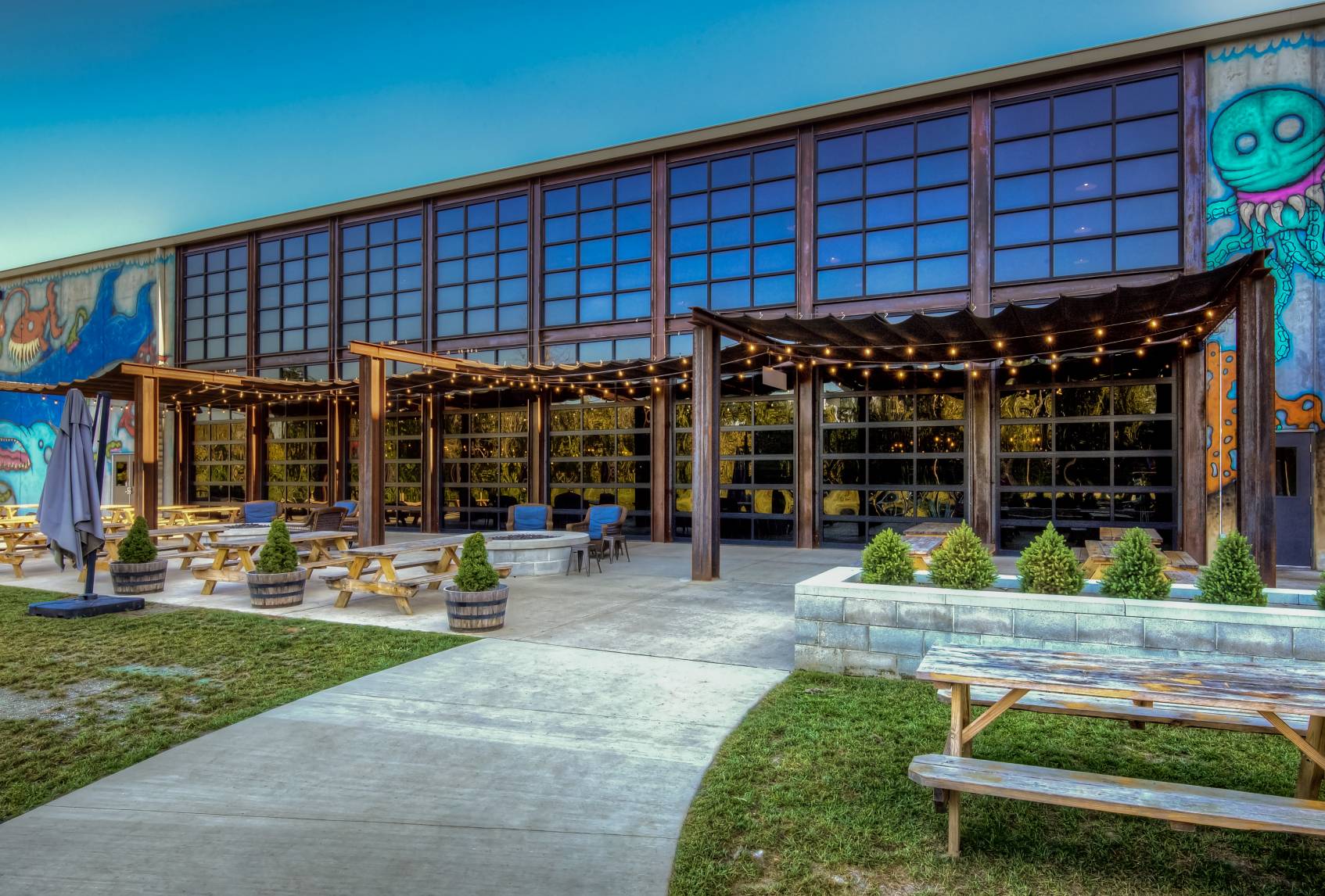 "Full-View glass garage doors running along the courtyard side of the facility incorporate the beautiful, modern lines that match the glass within the rest of the facility."